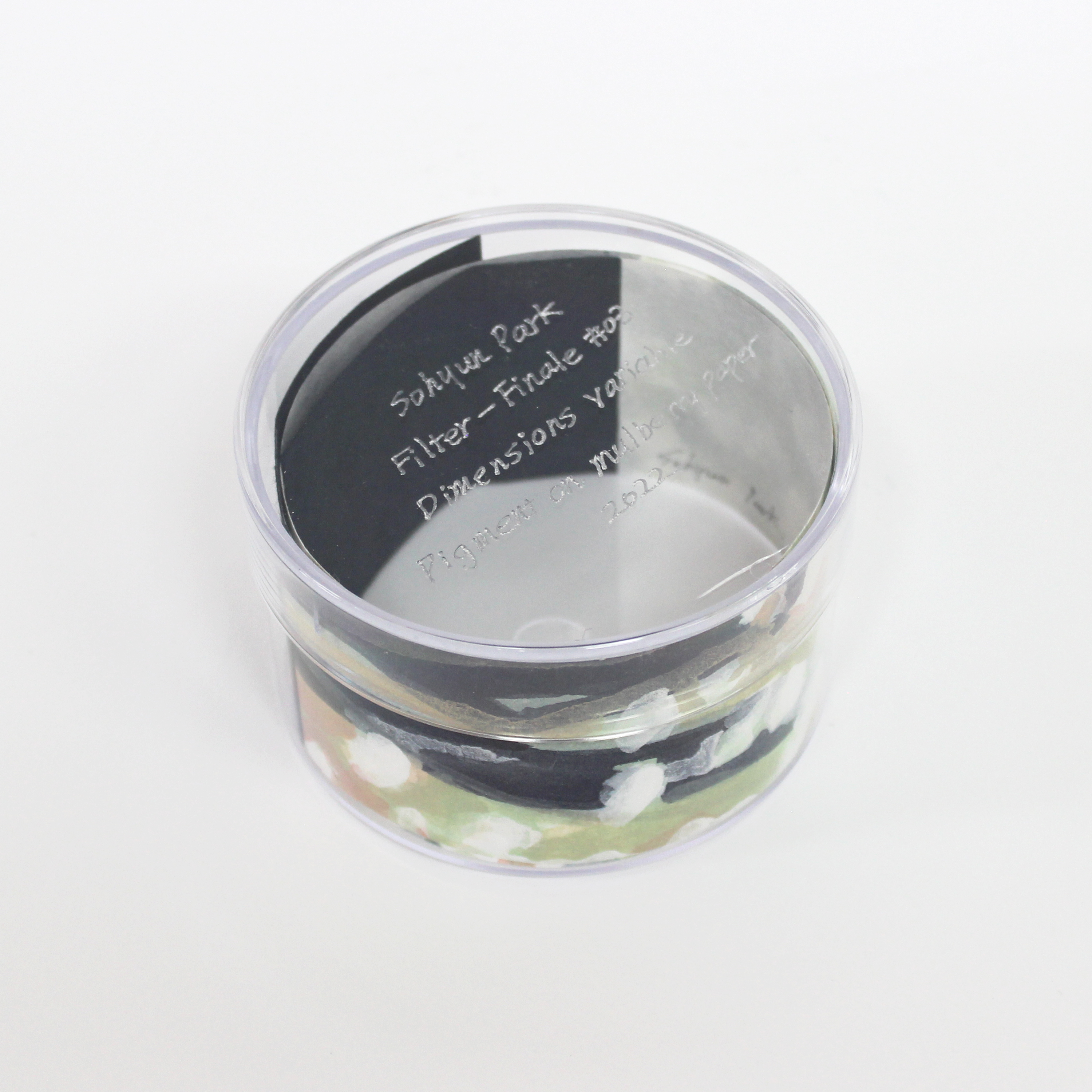 박소현 작가의 <바림한 풍경 Filter>는 전시 '물풍경'에서의 작품 일부를 보여줍니다. 띠 모양의 형태로 벽에 고정하거나 공중에 매달아 감상할 수도 있고, 아크릴 원형 케이스에 담아 여러 각도로 돌려가며 감상할 수 있는 가변적인 작업입니다.