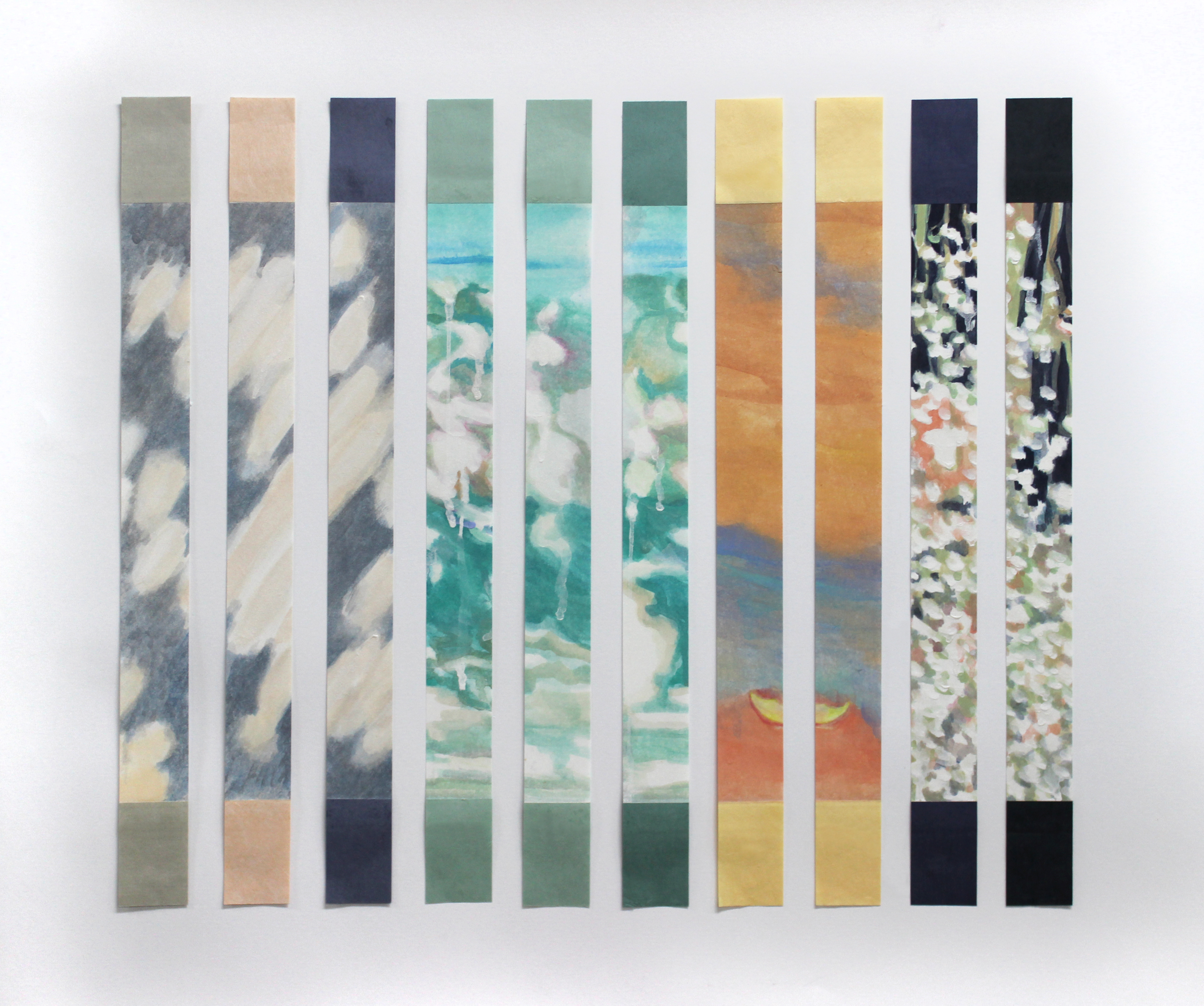 ‘<바림한 풍경 Filter>는 어떠한 풍경에 리트머스 종이를 푹 담갔다가 뺀 흔적과 같은 흡수된 단면이다. ≪물풍경≫에서 <바림한 풍경 — 아침 노을>, <바림한 풍경 — 저녁 노을>은 바깥의 풍경과 가장 가까이에 맞닿아있는 창문 틀에 작업을 설치하여 어떤 시공간이 묻어나있는지를 상상하게 하고 또 날씨와 시간대에 따라 달리 보일 수 있게 하였다.’