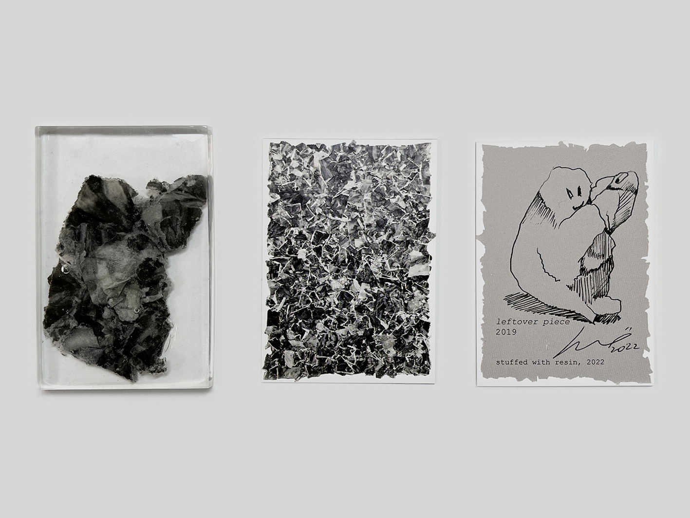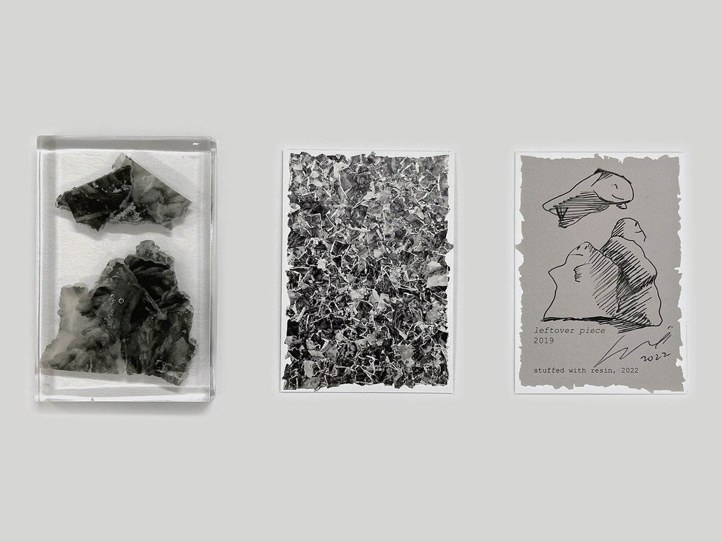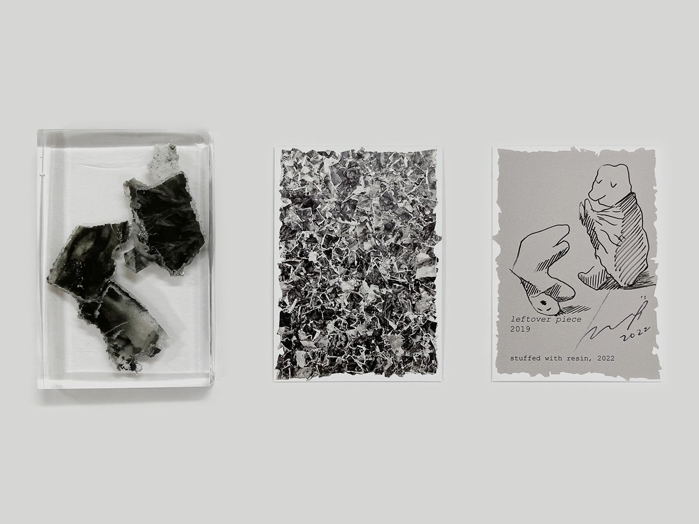 이은지 작가가 2019년에 제작한 페이퍼 한 면을 조각 내어 박제하였습니다. 작가는 해당 조각별로 찢어진 모양에서 느껴지는 인상을 드로잉으로 옮겨 감상을 제안합니다. 전시 조각은 총 10개로 제작되었으며, 도록 한 권에 한 조각씩 전달됩니다.