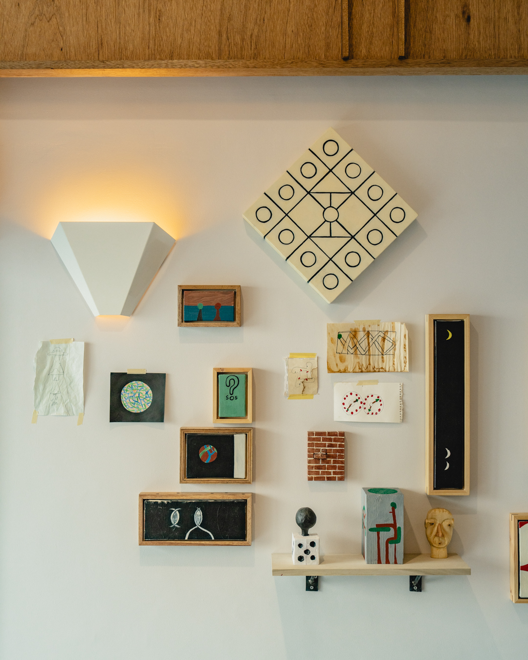 Symbols depicted with delicate yet sturdy lines, thickly layered paints, and symbols that seem ready to burst to life, freely roam the exhibition space, welcoming visitors. Paintings, drawings, and woodworking objects form a triangle, encircling us. Nishi's <Imagine> allows for both simplification and enrichment of the essence of the subject, providing ample space for both artwork and viewer's imagination to interact freely.
