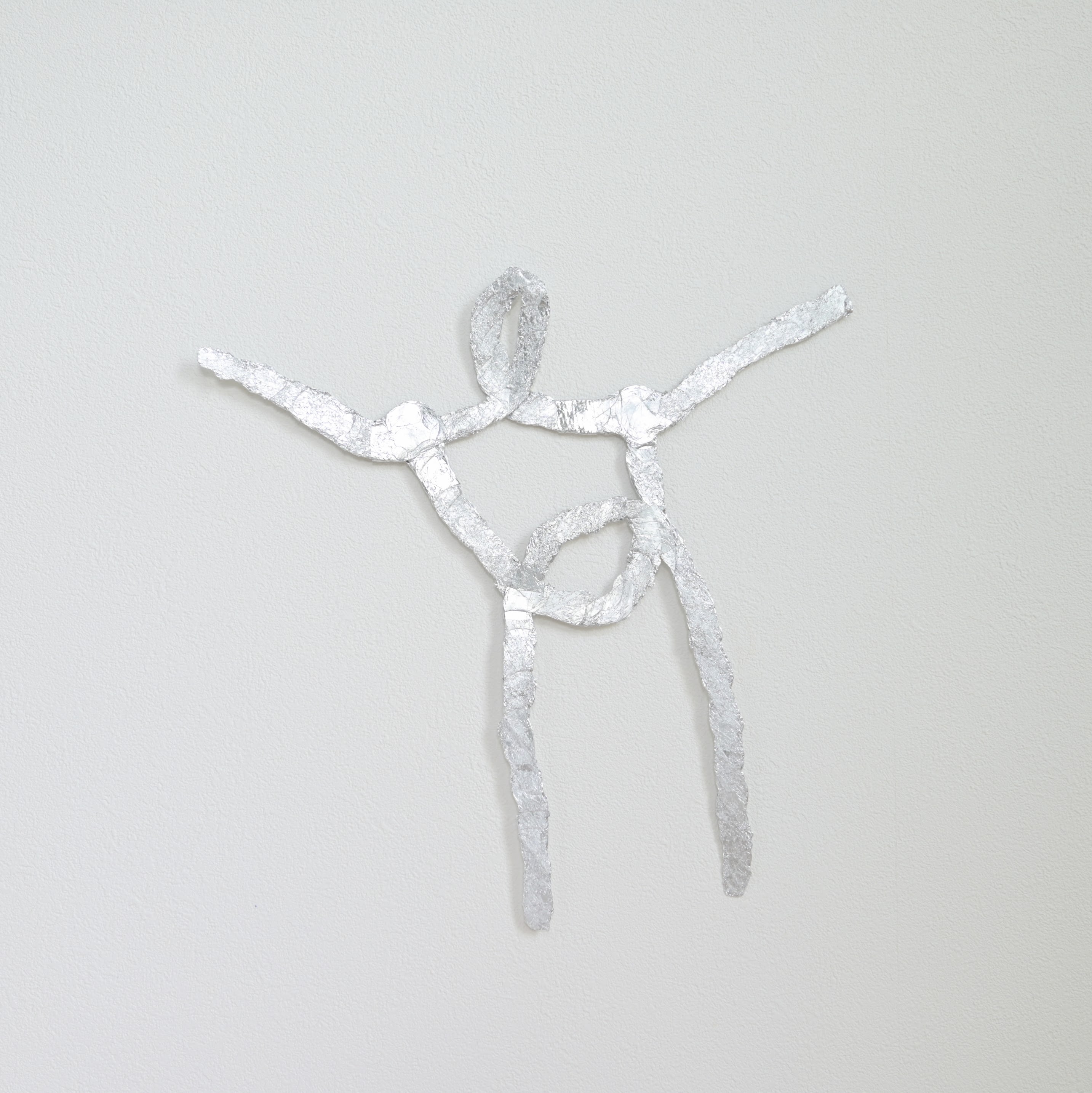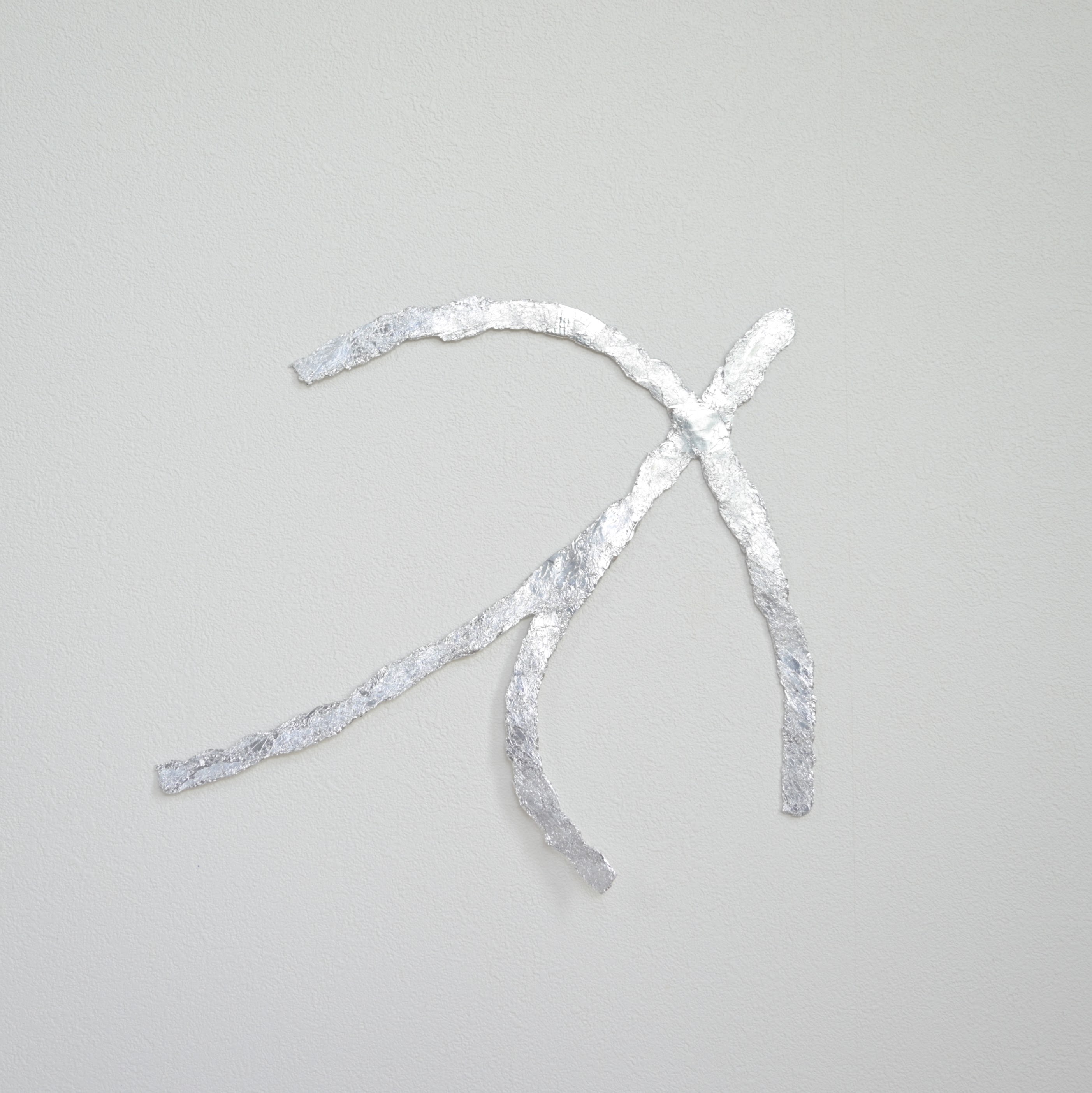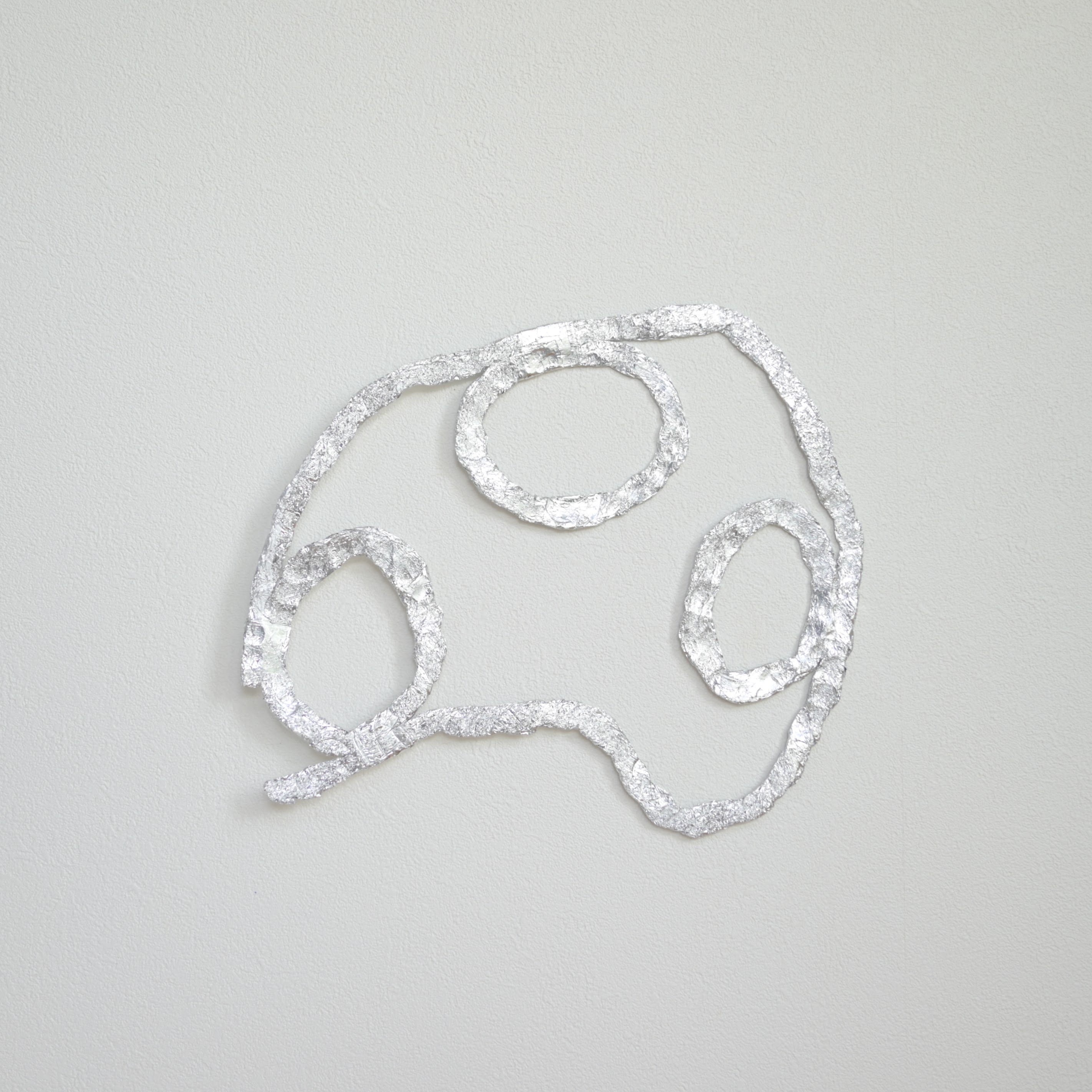Suspended from the ceiling at Pokettales are Riko's mobile works, which float freely, attached to a wooden structure resembling a stick chart. These pieces can appear as flat drawings or disappear into a single line, depending on the currents created by the viewers. The mobiles, made from folded aluminum foil, showcase both the qualities of drawing and sculpture. The <chart> series, inspired by the stick charts, features organic lines that come together to form what seems like a map of the space. Unlike the stick charts made from wooden sticks, the delicate texture of the aluminum foil feels both unfamiliar and familiar, given the everyday nature of the material. Thus, while Riko's works possess a cool texture, they also convey a warmth due to the familiarity of the materials used.