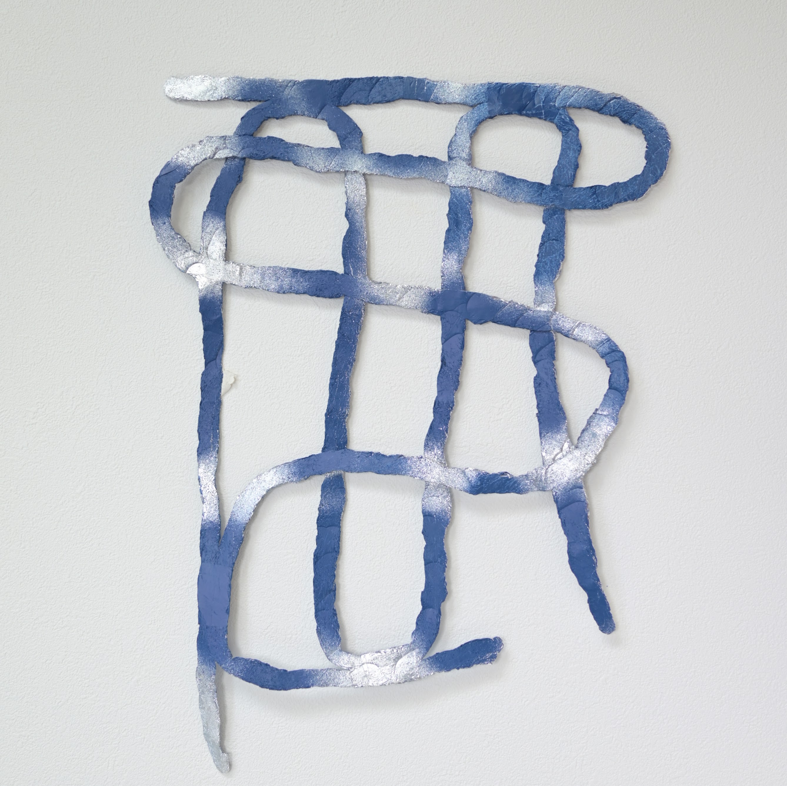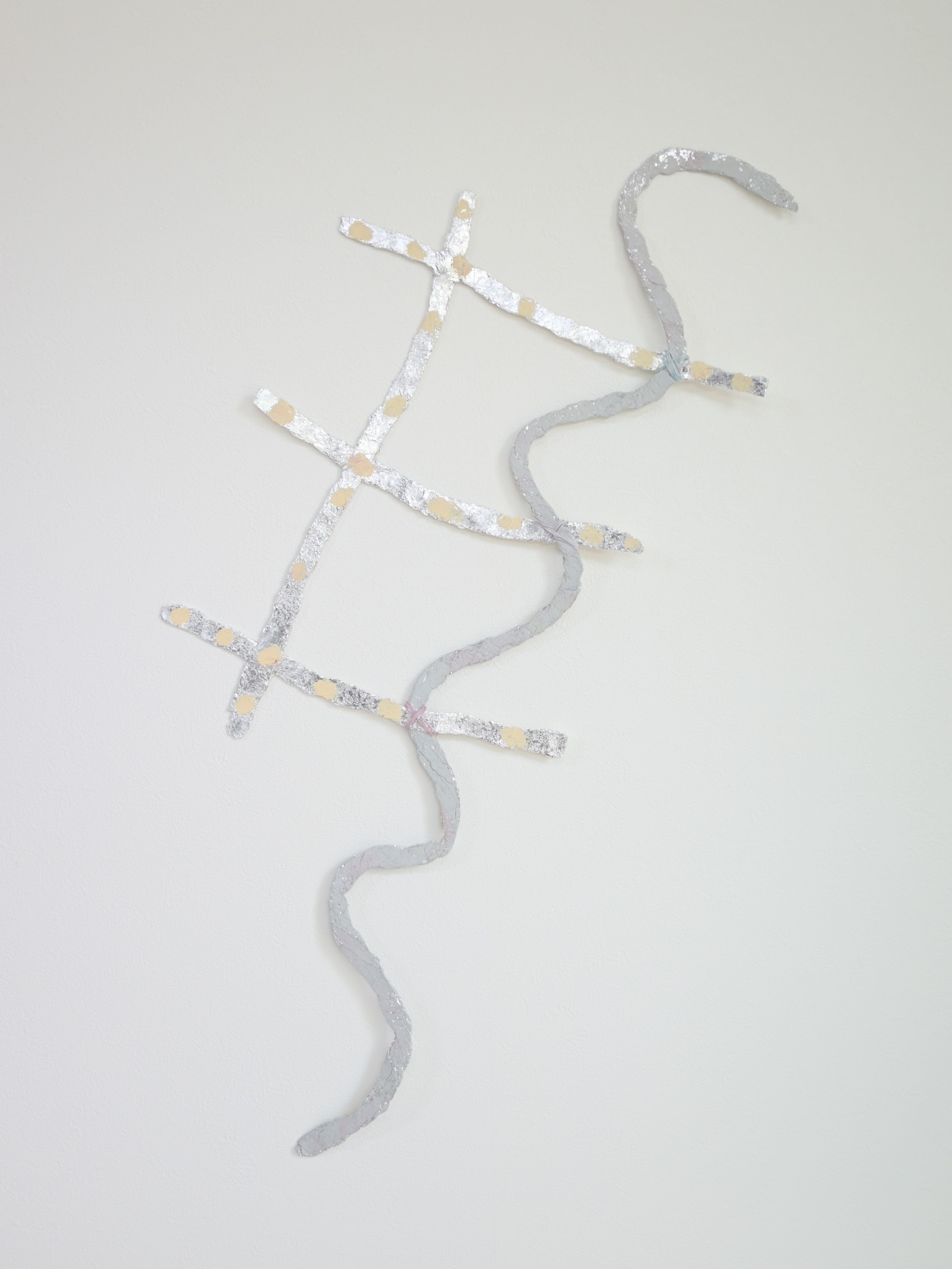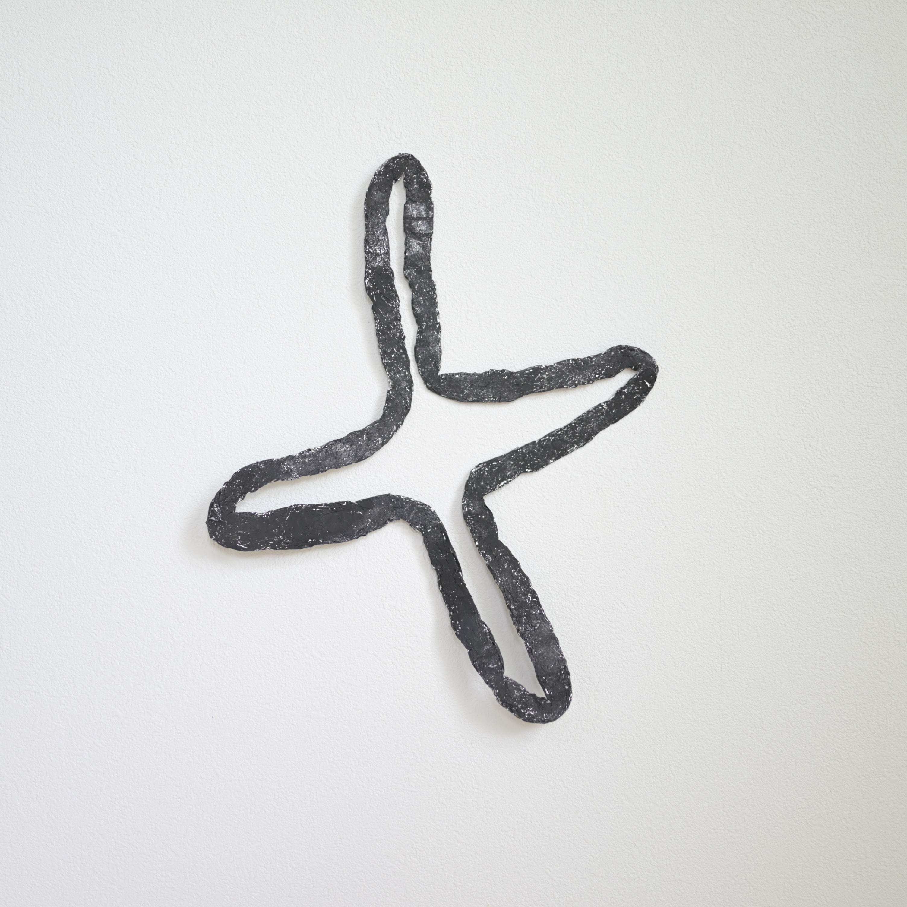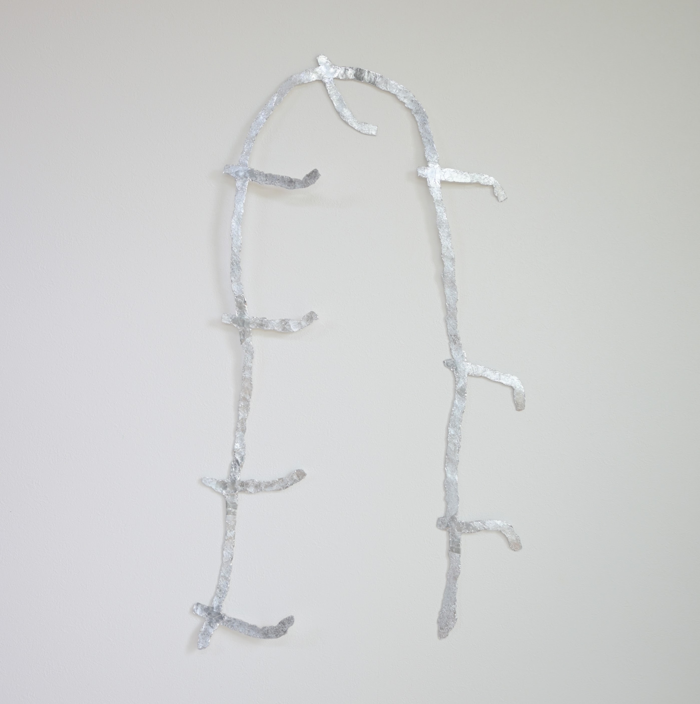 Suspended from the ceiling at Pokettales are Riko's mobile works, which float freely, attached to a wooden structure resembling a stick chart. These pieces can appear as flat drawings or disappear into a single line, depending on the currents created by the viewers. The mobiles, made from folded aluminum foil, showcase both the qualities of drawing and sculpture. The <chart> series, inspired by the stick charts, features organic lines that come together to form what seems like a map of the space. Unlike the stick charts made from wooden sticks, the delicate texture of the aluminum foil feels both unfamiliar and familiar, given the everyday nature of the material. Thus, while Riko's works possess a cool texture, they also convey a warmth due to the familiarity of the materials used.