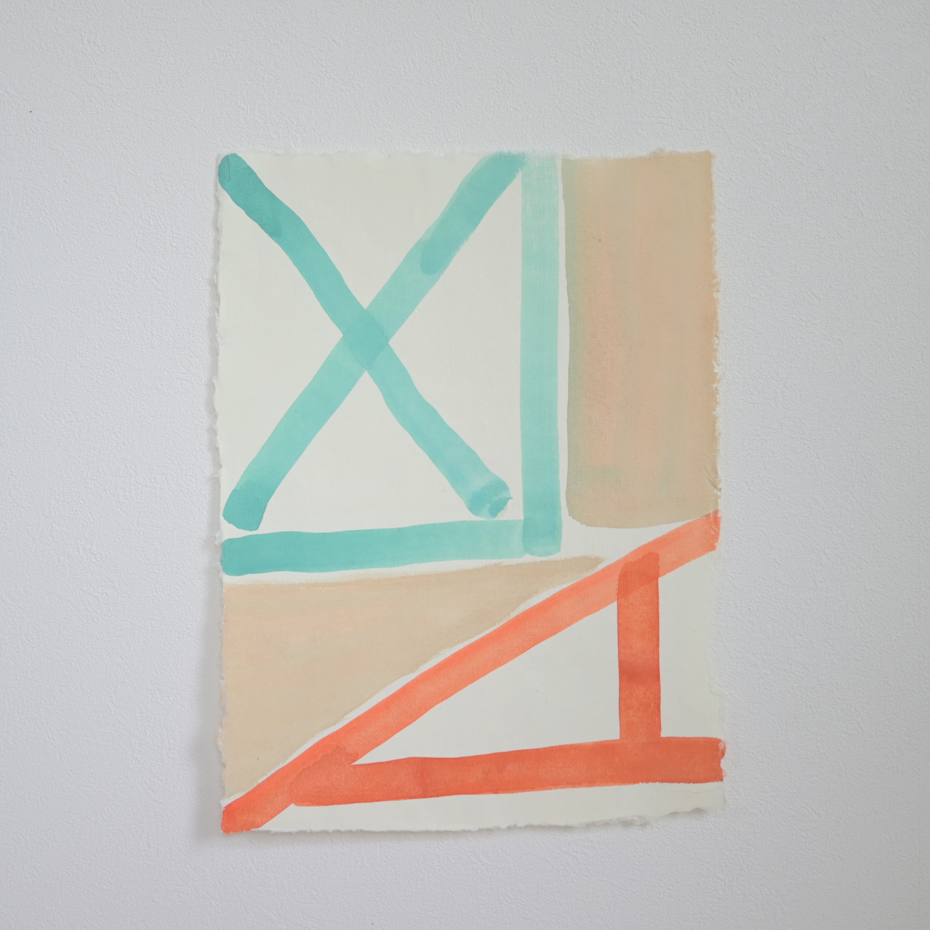 An aluminum mobile hanging from the ceiling changes direction depending on the air conditioner or the wind blowing by people, constantly changing the expression of the room. The drawings, made with gouache on paper, exist as sketches of events occurring in space, and as a tool to visualize phenomena that are sometimes invisible to the naked eye.
