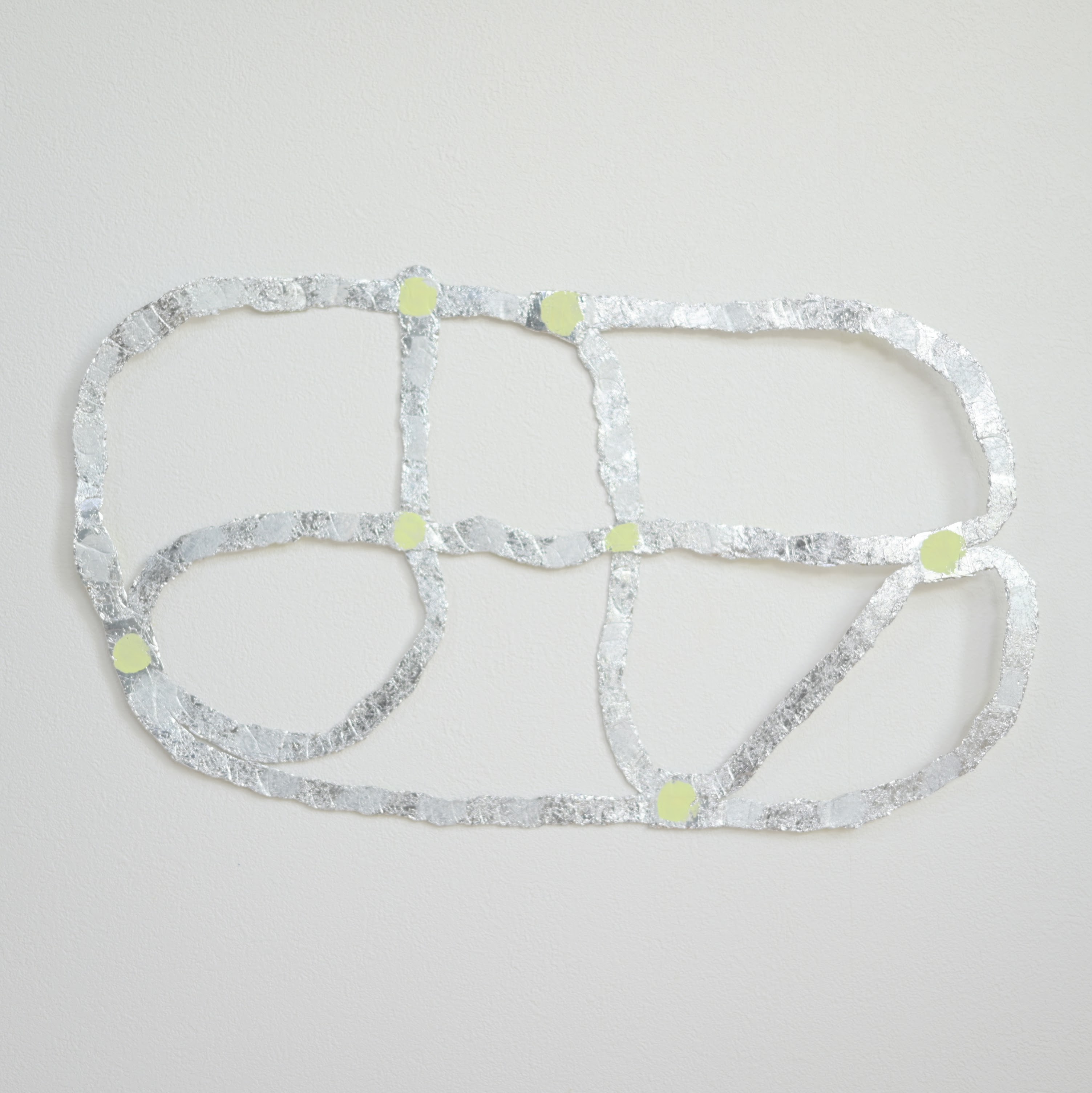주재료인 은박을 벗어난 드로잉 작품들도 공간 곳곳에 등장한다. 이 <plate> 시리즈는 추상적 형상들을 담고 있다. 투명하지만 확고한 선들로 이루어진 풍경은 공간에서 일어나는 동선의 기록지와도 같다. 공간에서의 움직임을 시각적으로 추적한현상들은 리코에 의해 종이 위로 출력된다. 스틱 차트처럼 또 다른 지도로서 도구의 역할을 한다고 볼 수 있다.